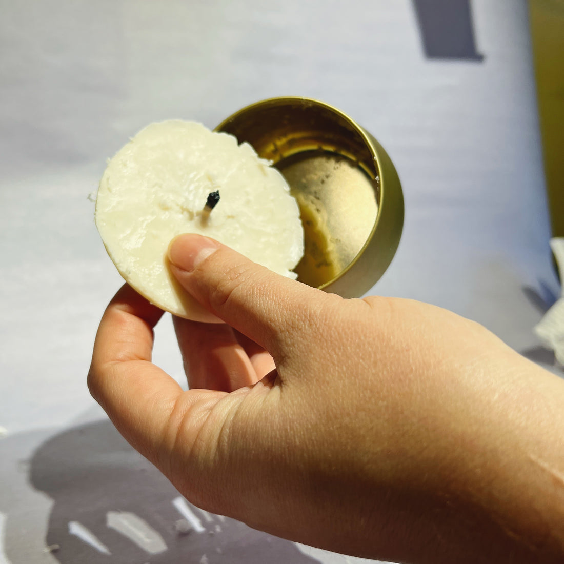 For gold tins - push the bottom gently with your fingers until the wax "pops" off the bottom. Using a paper towel, reach into the candle to remove the chunk of wax.