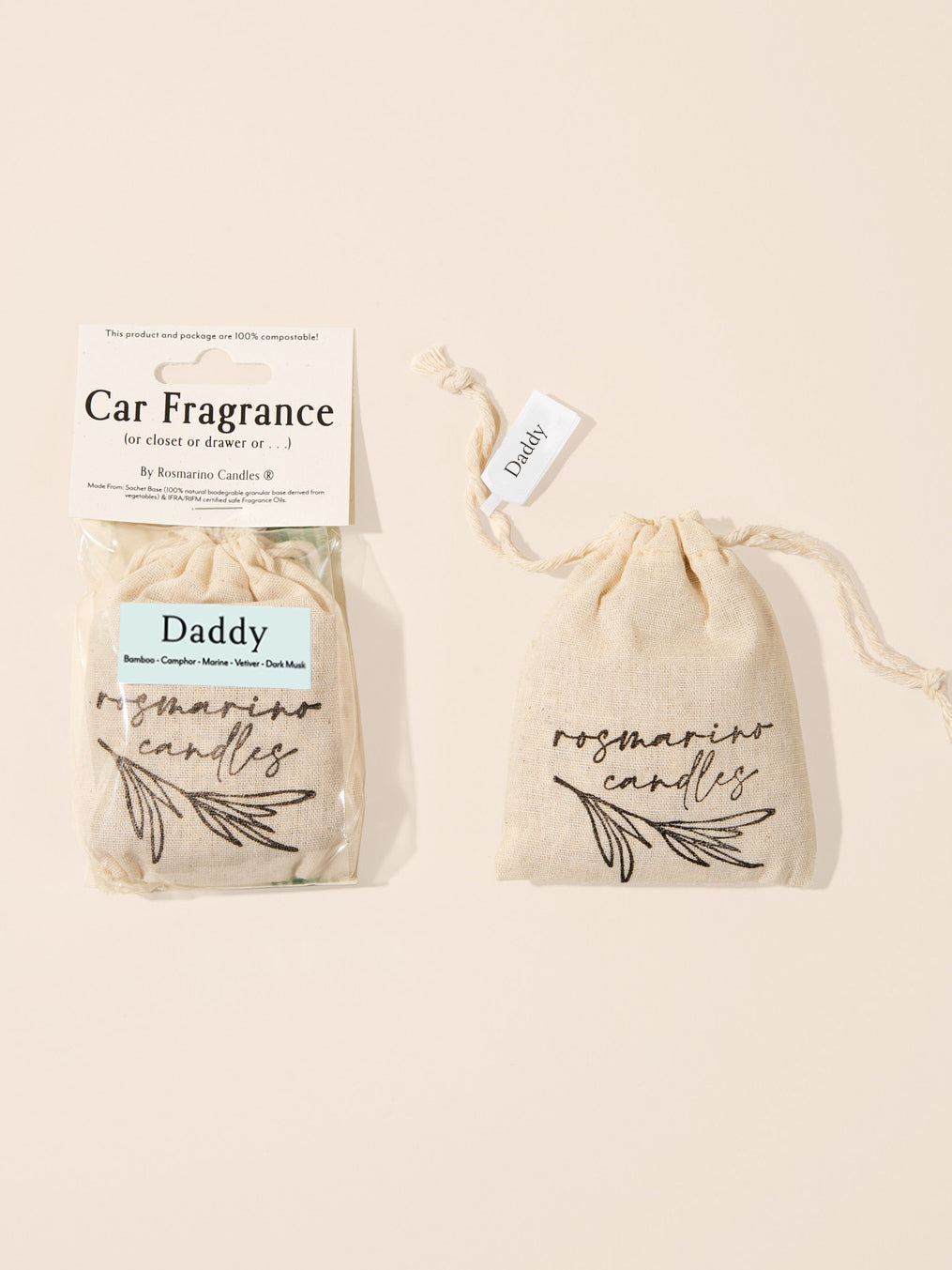 - Like all other Rosmarino Candles products, our Car Fragrances are packaged in fully compostable materials (wood pulp bio-plastic and a recycled paper tag).