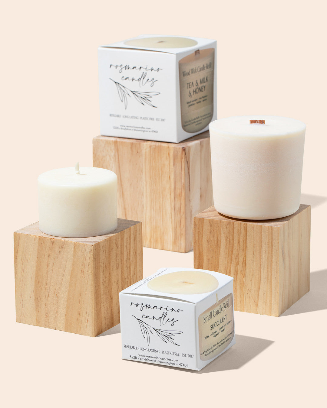 Cut down on your closet space (we all have a shelf of pretty empty candle jars we won't throw away) by buying a refill for your candle tin. These are specially made for Rosmarino Candles Gold Tins, so don't just toss this into any jar you find.