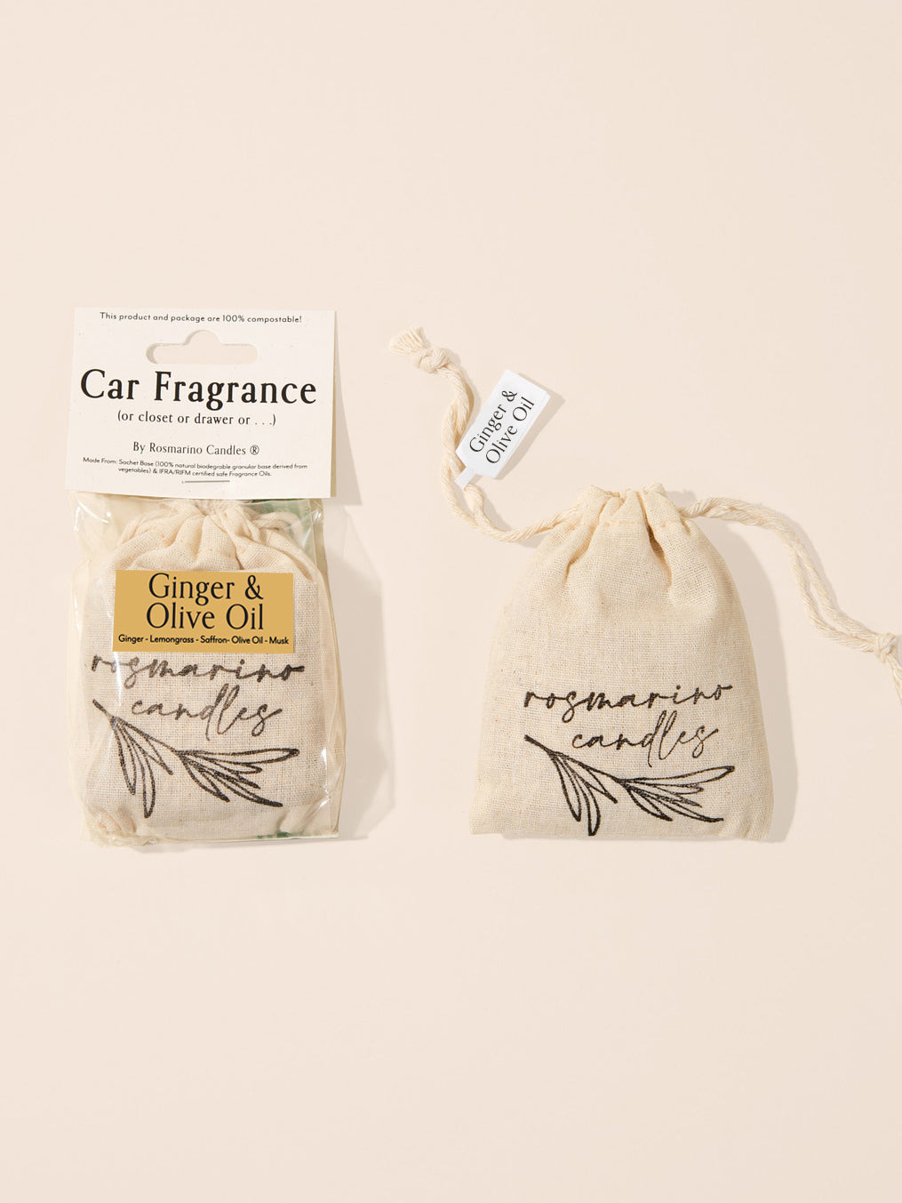 - Like all other Rosmarino Candles products, our Car Fragrances are packaged in fully compostable materials (wood pulp bio-plastic and a recycled paper tag).