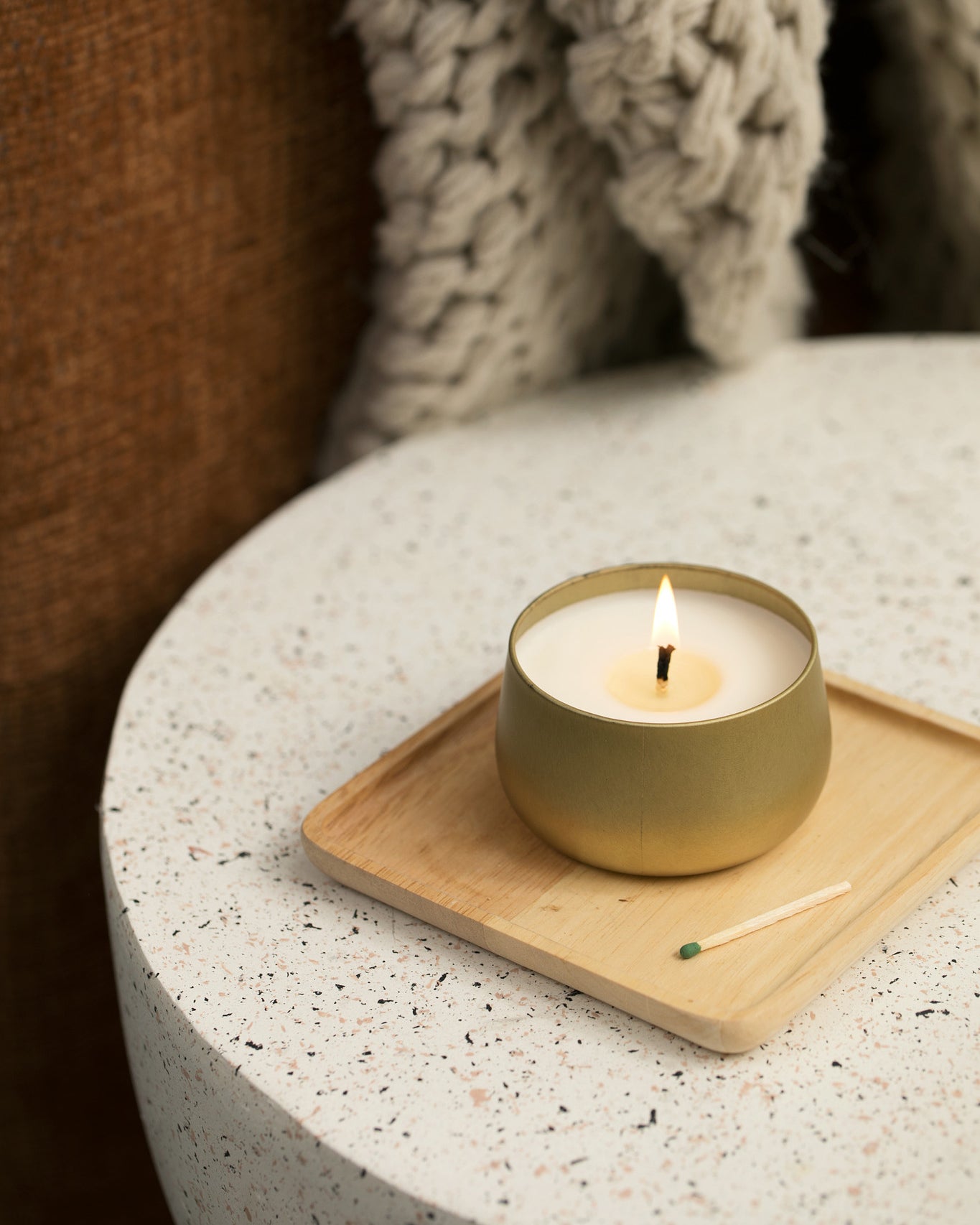 Remarkably minimalist, our Gold Tin Candle line is made of a unique fat bottom shape and is the perfect size and price for gifting. The label is just on the lid to effortlessly match any space.