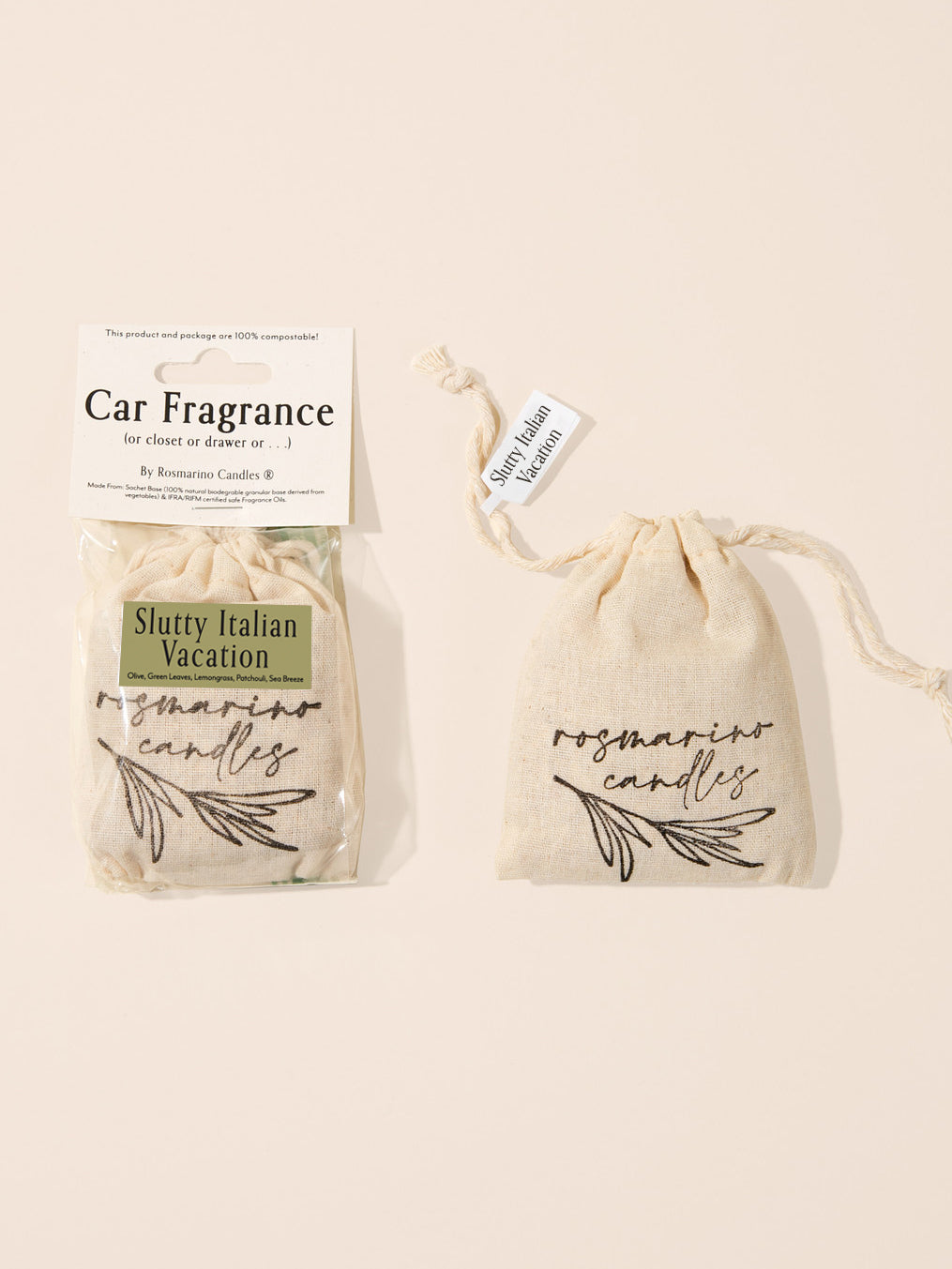 - Like all other Rosmarino Candles products, our Car Fragrances are packaged in fully compostable materials (wood pulp bio-plastic and a recycled paper tag).